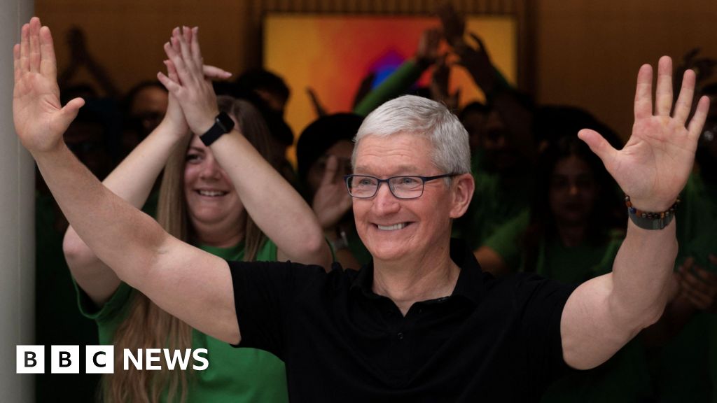 Reuters Apple CEO Tim Cook in a black t-shirt gestures with both hands during the inauguration of an Apple retail store in New Delhi, India, April 20, 2023Reuters